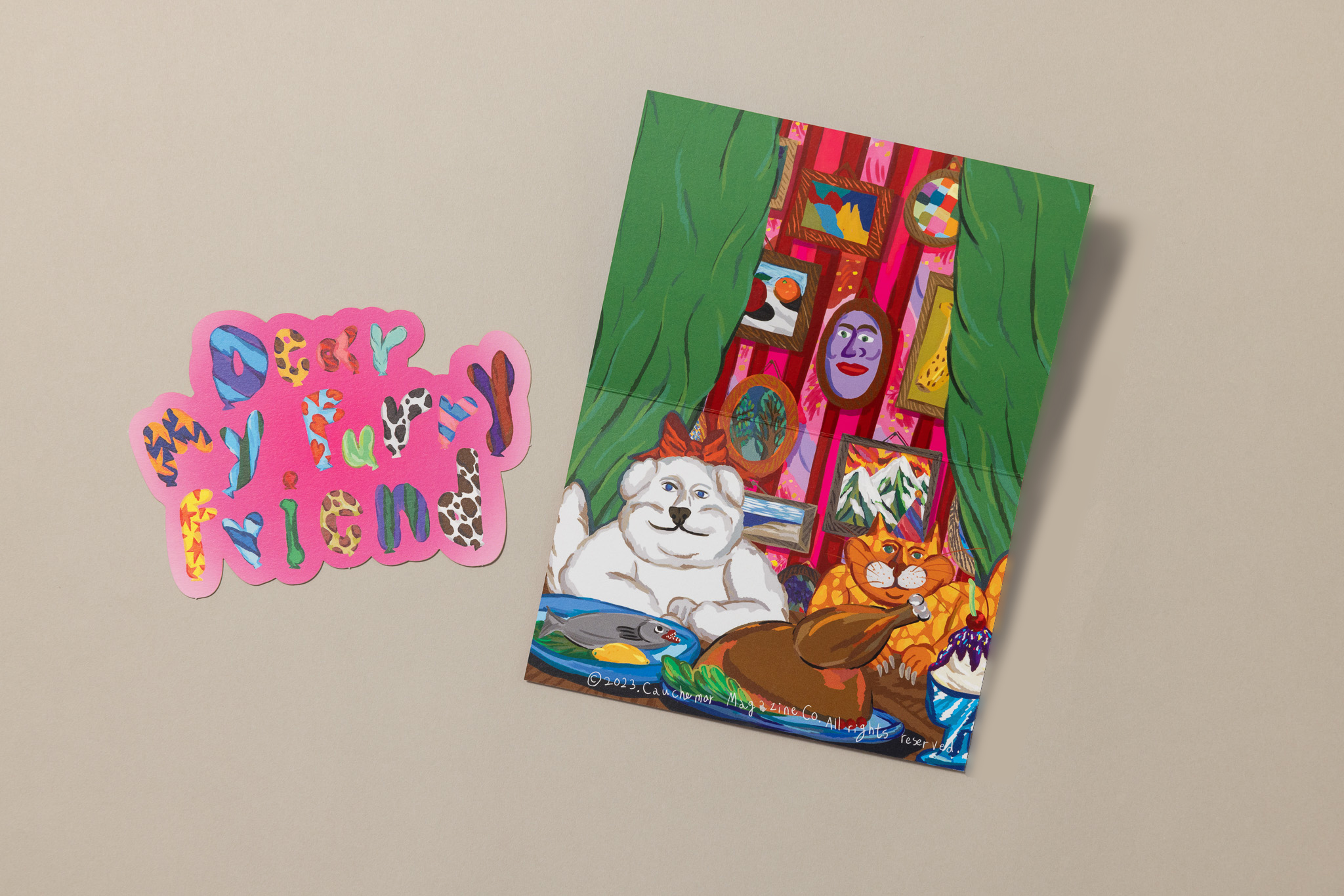 Postcards & Small Goods: Protected with a transparent sleeve and a paper header featuring the brand's unique graphics.
